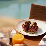 Hotellet har Grieks restaurant, som serverer Griekse kogekunst. Restaurant Karina behandler gæster med Europese gerechten måltider og er omkring 150 meter væk.